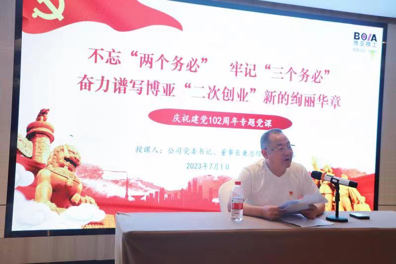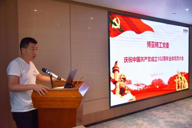 當天晚上,在住宿酒店會議室組織召開了“慶祝建黨102周年全體黨員大會”。會議舉行了老黨員重溫入黨誓詞和預備黨員入黨宣誓儀式,黨委書記李總給預備黨員發放了《黨章》和《政治生日賀卡》。在會上表彰了公司2022—2023年度優秀共產黨員,杜紅波、周微、馮攀、李波、劉軍5名同志獲此殊榮。隨后優秀黨員代表劉軍作了表態發言,公司黨委委員輪流圍繞各自分管黨務工作談了認識和體會。最后,黨委書記李總以《不忘“兩個務必”、牢記“三個務必”,奮力譜寫博亞“二次創業”新的絢麗華章,爭做市場經濟條件下的道德模范》為題向大家講授了專題黨課。